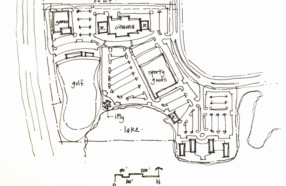 To work on a project over the course of two or more years may seem laborious, but multiple iterations and collaborative study can result in a plan that not only meets development goals, but also creates a vibrant public center with a dynamic tenant mix. Developers of this mixed-use project located in a high-growth area of Florida's Gulf Coast saw a need for destination-retail to serve surrounding office and residential uses. The project evolved over time as the team began to realize the value of adding sports-oriented uses and, eventually, a theme that would draw big name retailers, restaurants, and entertainment venues in a symbiotic shop-dine-play town center development. Boulevard Studios provided planning services, every version carefully considering parking distribution, vehicular and pedestrian circulation, maximum tenant visibility, and "best and highest" use of the assembled parcels.